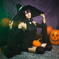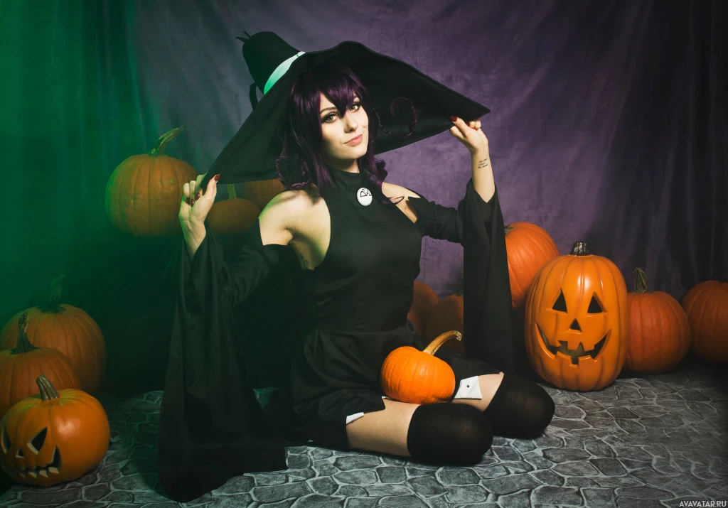purple hair and has makeup that accentuates a witch-like appearance, including darkened eyes and dark lipstick. They are dressed in what appears to be a Halloween costume, resembling