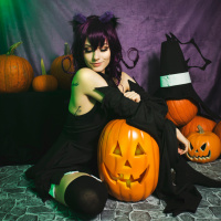 На картинке изображен человек с фиолетовыми волосами, одетый в костюм, похожий на костюм ведьмы, сидящий на полу в окружении украшений для Хэллоуина. Человек держит фонарь в виде тыквы, а на заднем плане видны дополнительные тыквы. Обстановка предполагает проведение праздничного или тематического мероприятия, связанного с празднованием Хэллоуина.