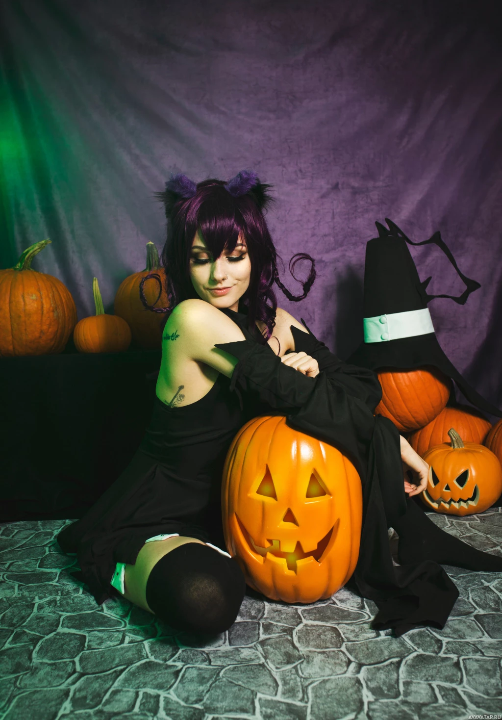 The image features a person with purple hair, wearing a costume that includes what appears to be a witch outfit, sitting on the floor surrounded by Halloween decorations. The individual is holding a jack-o'-lantern, and there are additional pumpkins in the background. The setting suggests a festive or themed event associated with the celebration of Halloween.