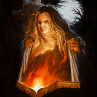 a young woman with long blonde hair, who appears to be holding a book or a spellbook that is emitting flames. She seems to be casting