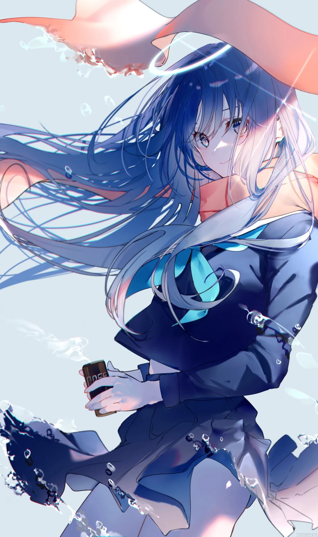 blue hair, wearing what appears to be a school uniform with a tie. She is standing in water that reaches her knees, and her outfit suggests she might be in