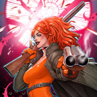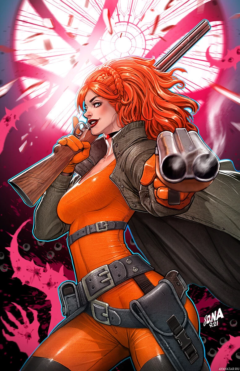 red hair, dressed in a costume that includes an orange or red jumpsuit-style outfit. She is holding a pair of guns, suggesting she may be portraying a heroic or