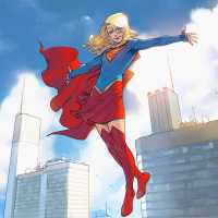 a superhero character, who appears to be Supergirl, flying through the air with outstretched arms. She is wearing her