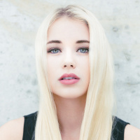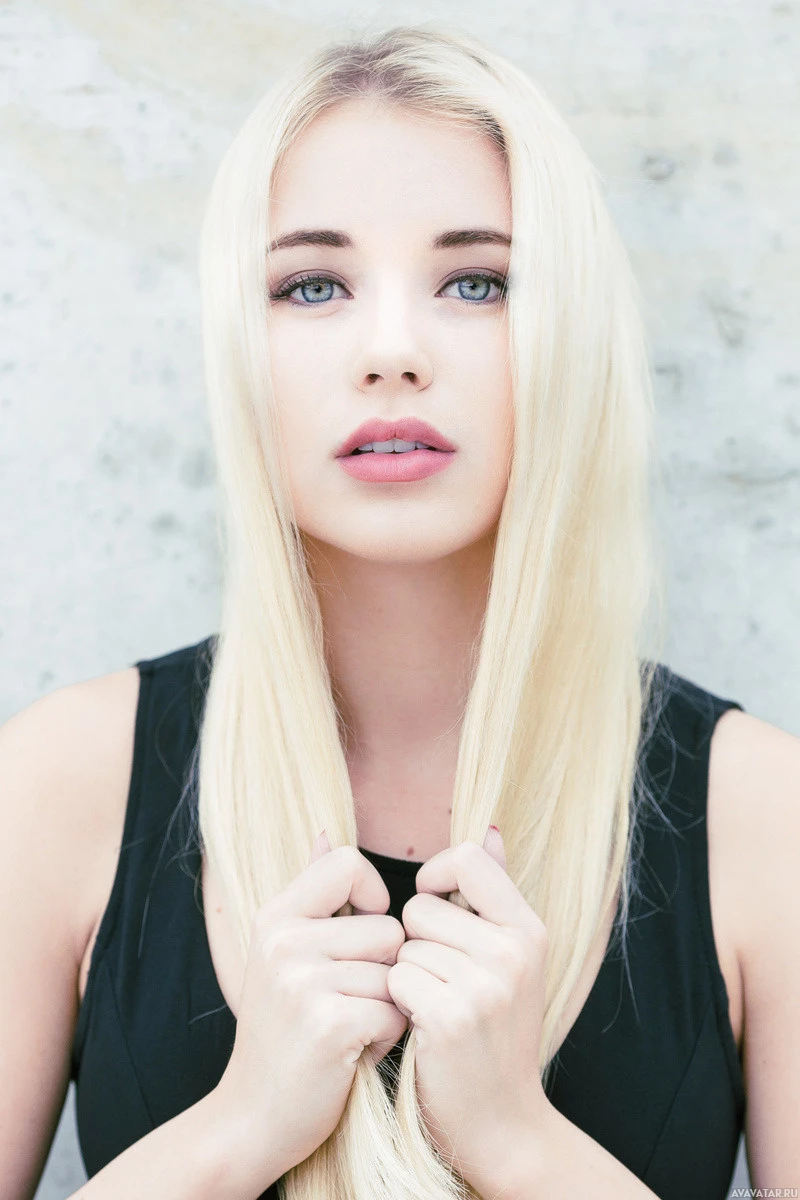 blonde hair looking directly at the camera. She has