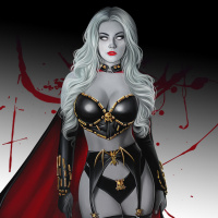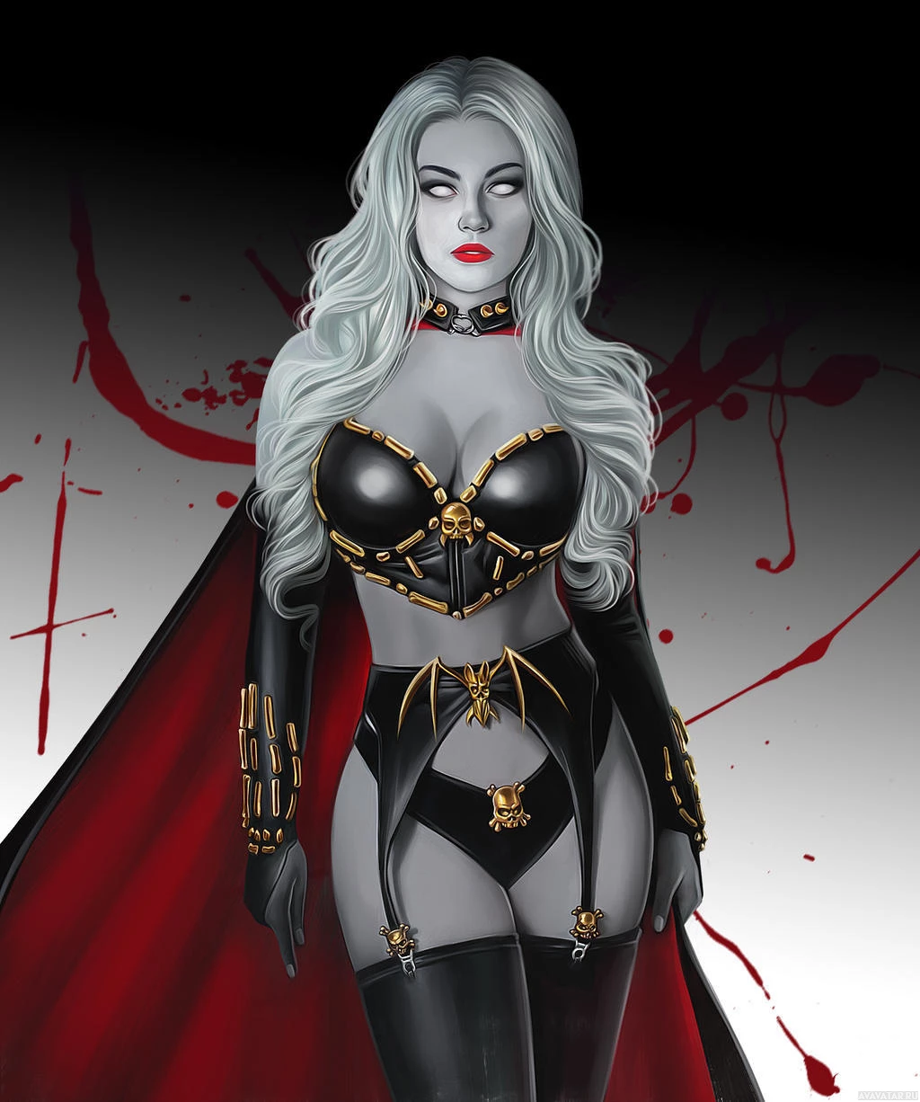 a female character with long white hair, dressed in a fantasy-inspired outfit. She wears a corset and a cape, which, along with the Gothic elements of her attire, gives off a vampiric or dark fantasy theme. The background has splattered paint, which adds to the dramatic and supernatural ambiance of the image.