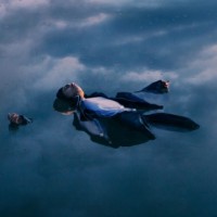 The image depicts a person lying face down on water, creating a reflection that mirrors the individual. The person appears to be in a distressed state, possibly indicating
