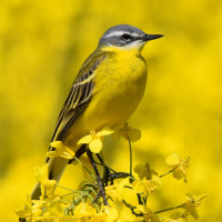 The image shows a small bird perched on top of what appears to be a plant with yellow flowers. The bird is colorful with shades of gray, black, and white markings on its body. The background features more of these yellow-flowered plants, suggesting that the photo was taken in a field or meadow with a dense growth of this particular type of vegetation.
