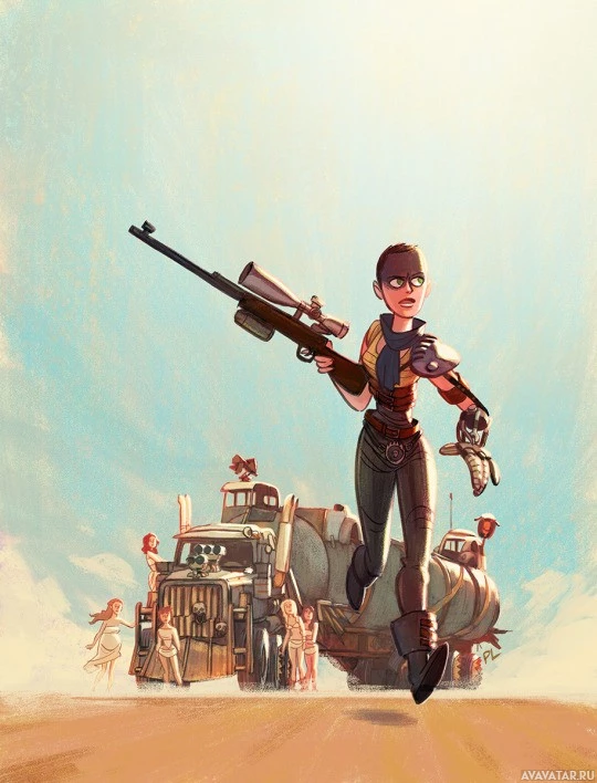 a gas mask and carrying a rifle, indicating she may be in a situation that requires defensive measures or is part of an action sequence typical of such films. In the background, there are desert-like landscapes with sand dunes and what appears to be a truck with other characters on it, suggesting a journey or adventure in this