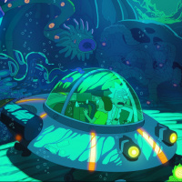 sea creatures. A spaceship is visible in the background, which adds to the sci-fi theme of the show. The character Rick Sanchez can be recognized by his distinctive appearance: a pale complexion, large nose, and