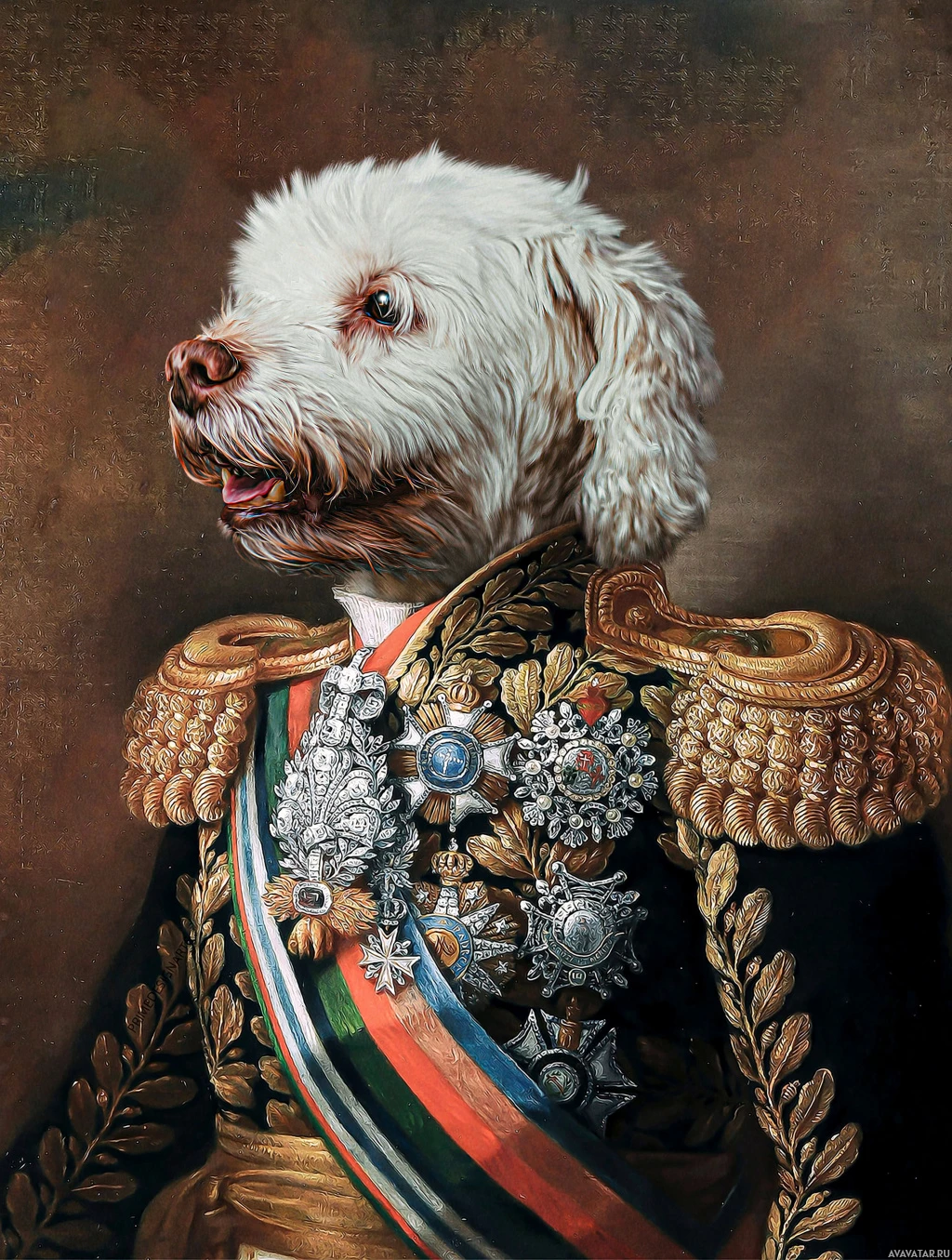 The image depicts a painting of a dog wearing a costume and regalia, including what appears to be a military-style uniform with medals and decorations. It seems to be a whimsical or satirical