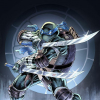 Изображение представляет собой стилизованную и динамичную иллюстрацию Леонардо, персонажа франшизы "Черепашки-ниндзя". Он изображен в боевой позе, сжимая в правой руке пару катан. Выражение его лица передает напряженность и готовность к бою. Фон выполнен в зловещих темных тонах, которые подчеркивают остросюжетный характер сцены.