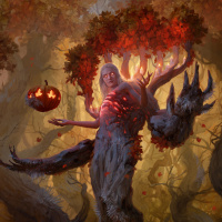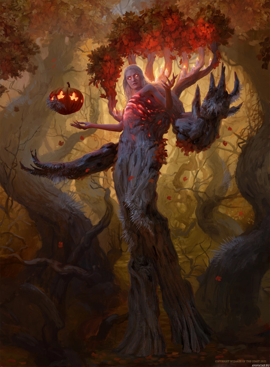 a fantasy scene featuring a humanoid figure with the body of a woman and the head of a tree. This