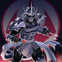 comic book or graphic novel illustrations. This character is dressed in armor with a helmet and appears to be holding a sword. Behind the character, there's a symbol that looks like a shield with a bolt-like design on it, which could possibly be a logo or emblem associated with this character. The overall impression is one of a warrior or fighter from a fantasy or superhero