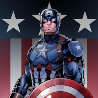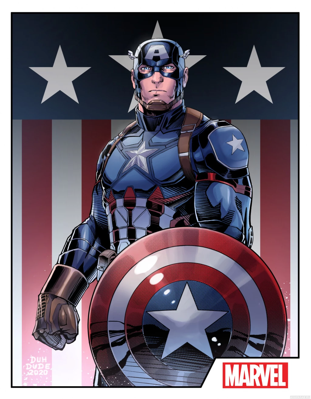 iconic costume with the shield and the red, white, and blue color scheme that represents the United States flag. The background includes stars from the American flag, reinforcing this patriotic theme.