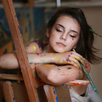 a young woman who appears to be an artist. She has closed eyes and is leaning against a chair with paint on her face, hands, and clothes, suggesting she may have been creating artwork or engaged in a painting session. She seems relaxed and content, possibly taking a break from her work. The setting looks like a studio or a workspace where artistic activities take place.