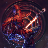 the Star Wars franchise. The character has a humanoid form with red skin and is adorned with various