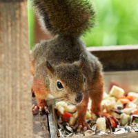На картинке изображена белка, поглощающая пищу на открытом воздухе. Белка тянется к миске с орехами, которые, по-видимому, являются основным источником пищи для этого животного.