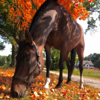autumn foliage. The horse is wearing a bridle and appears to be eating some grass or vegetation from the ground, which suggests it might be grazing. The leaves on the ground are orange, yellow, and brown, indicating that it's