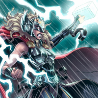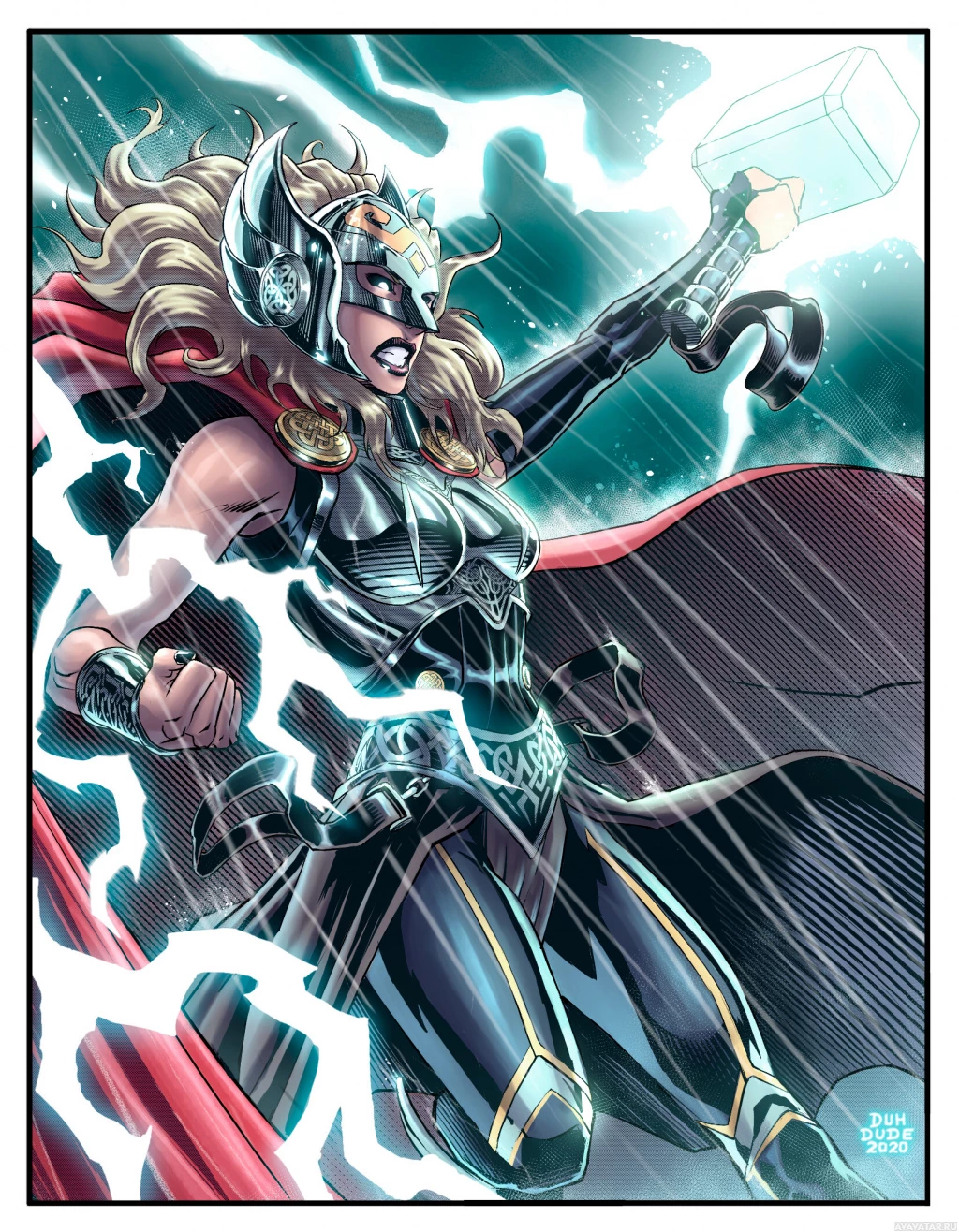 The image depicts an illustration of a superhero character known as "Thor," from the Marvel