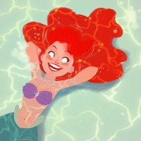 The image shows an animated character resembling Ariel from the Disney movie "The Little Mermaid." She is depicted with a friendly smile and appears to be lying in water, which suggests her mermaid nature.