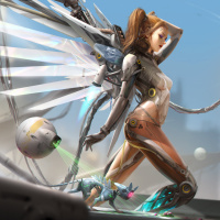 an illustrated character that appears to be a fusion of human and robotic elements. She has wings like an angel, suggesting she may have some sort of celestial or mythical origin blended with