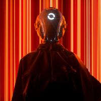 The image depicts a stylized figure wearing a helmet with a visor, standing against a backdrop that has