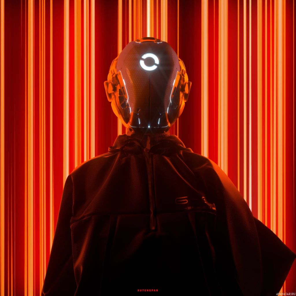 a science fiction theme, possibly representing a futuristic or cybernetic entity due to the helmet's design and the context suggested by the image's description. The character's attire and the overall aesthetic suggest they might be a protagonist or antagonist in a story that involves