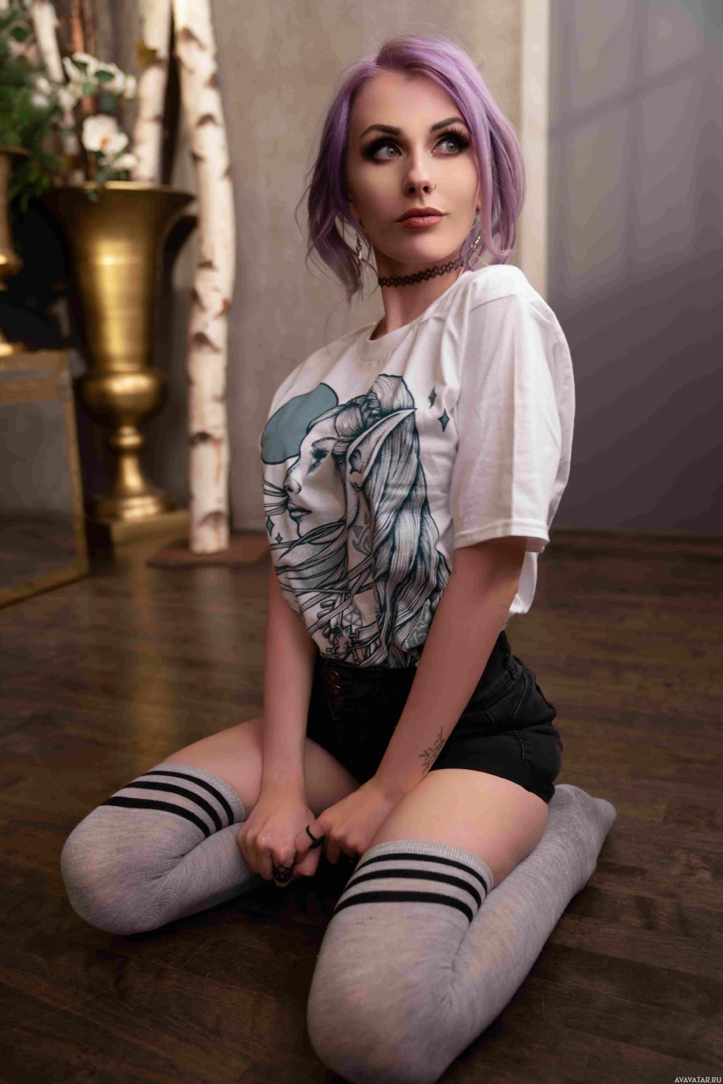 a young woman with purple hair. She is sitting on the floor with one leg crossed over her knee, posing for the camera. Her attire includes a graphic t-shirt and she is wearing knee-high socks with stripes at the top. In the background, there appears to be a chandelier hanging from the ceiling and what looks like