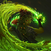 green hair that resembles foliage, and she is holding a staff topped with a glowing crystal or energy source. The character's skin appears to be pale with a subtle hint of moss or algae growth on her arm and shoulder area, reinforcing the idea that she has