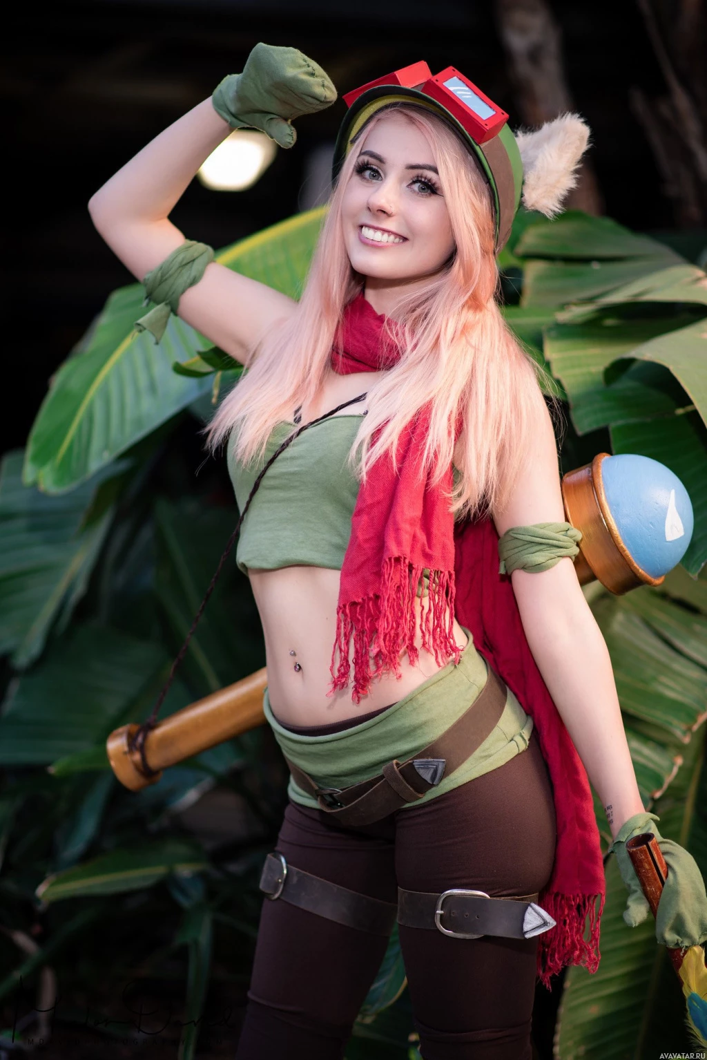 League of Legends." The individual is wearing a costume with elements such as a vest, belt, and gloves that are typical of the game's fantasy theme. They have a hairstyle that complements their character, complete with a headband, and they are holding what appears to be