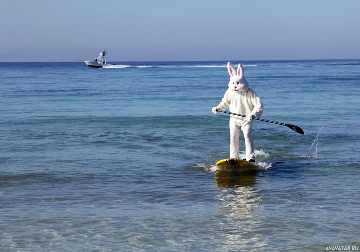 На снимке изображен человек, одетый в костюм негабаритного кролика на доске для серфинга. Это забавное и необычное зрелище, так как обычно не ожидается, что кто-то, одетый как пасхальный кролик, будет заниматься серфингом. Место действия, кажется, находится в океане в солнечный день с ясным небом.