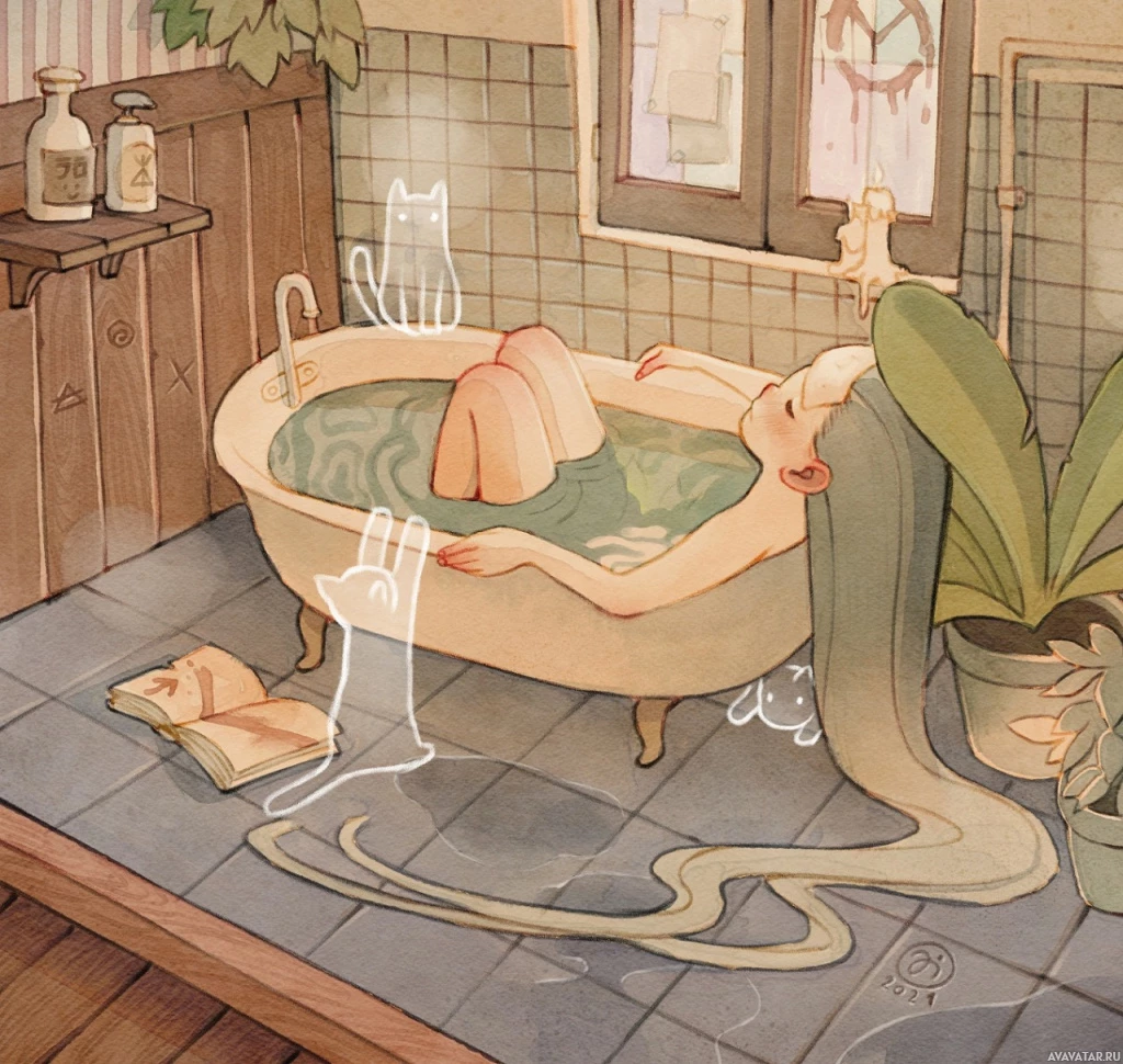 long hair that seems to be flowing, possibly indicating she's relaxed or asleep. A cat is floating near her face, which adds a playful element to the image. There are also several bottles and cups scattered around, suggesting