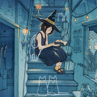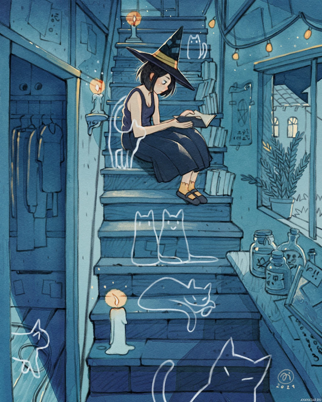 This image depicts an illustration of a character who appears to be a witch. The witch is sitting on a stairway, wearing a hat that is commonly associated with witches. She has her legs crossed and seems to be engrossed in reading a book. Surrounding the witch are