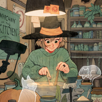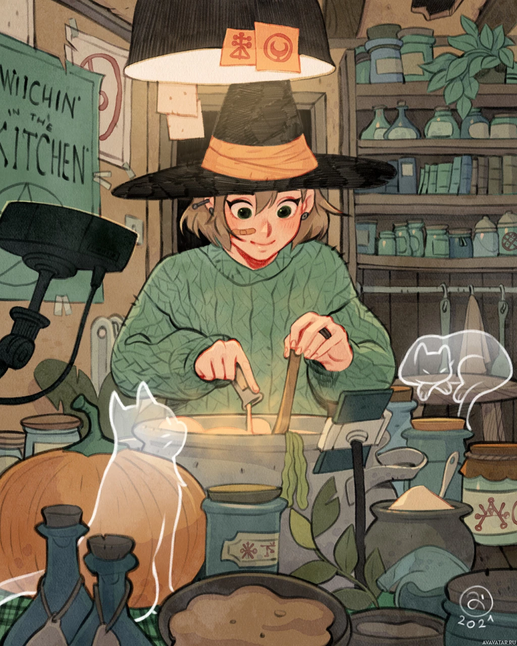 kind of potion or dish. There are various items around her, such as bottles, jars, and a cat that seems to be observing the girl's activities. The atmosphere appears whimsical and fantastical, fitting the theme associated with witches and magic.