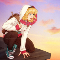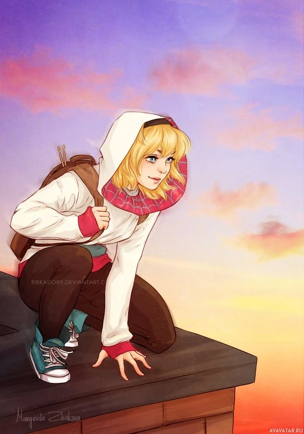 a dynamic pose, crouched on what appears to be a rooftop during either sunrise or sunset, given the warm hues of the sky. She's wearing a hoodie with the Spider-