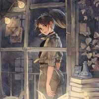 an animated girl standing by a window in what appears to be a dimly lit room. She has