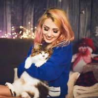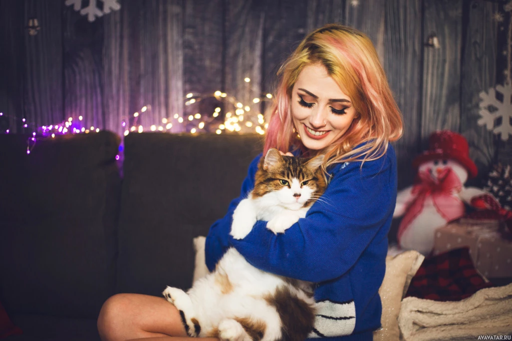 red hair who appears to be smiling. She has a cat in her lap that seems to be enjoying the attention as well. The setting suggests a cozy and festive environment, possibly during