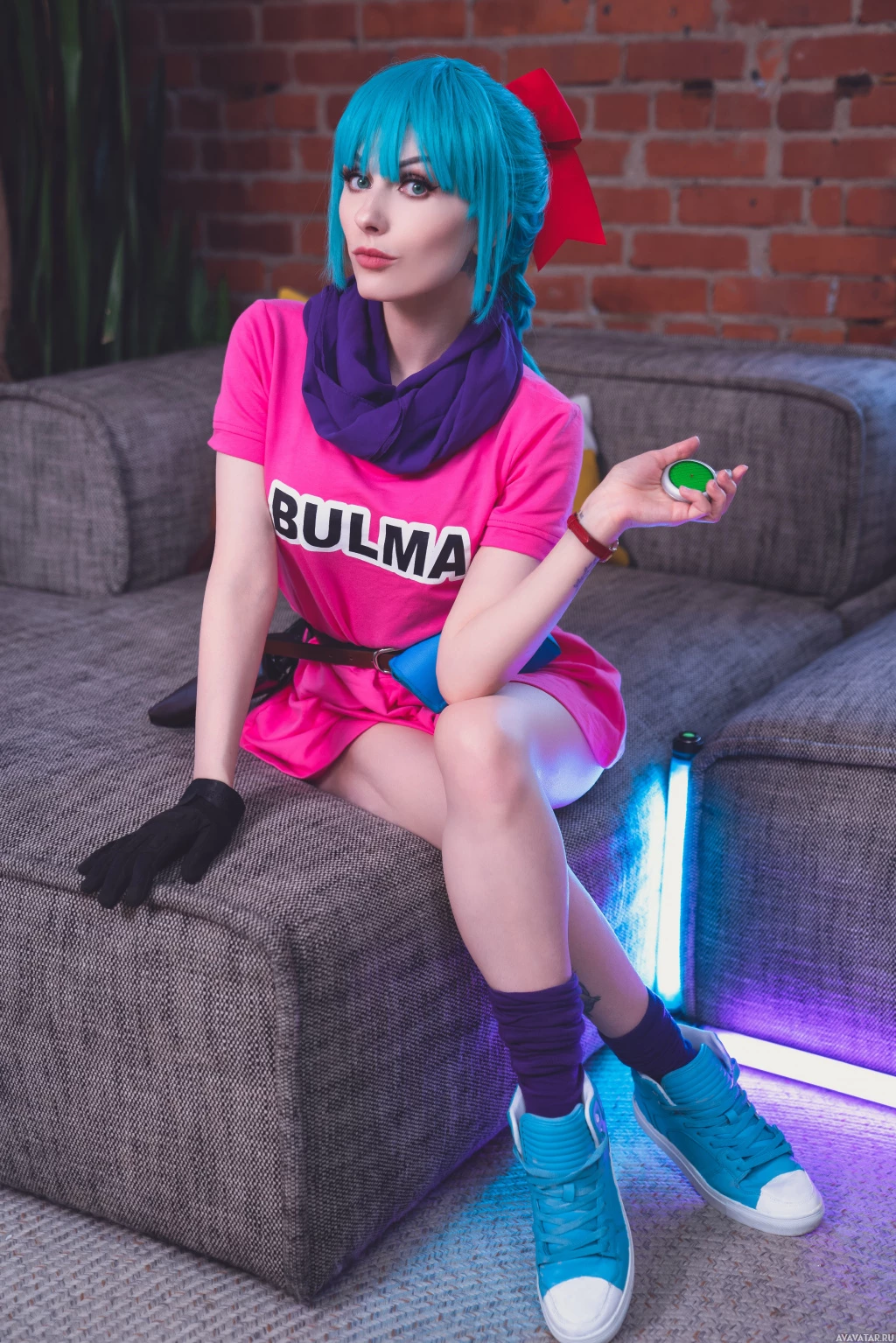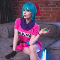 turquoise hair and is wearing a costume that includes pink clothing with the text "Bulma" on it, which is a reference to a character from the anime series "Dragon Ball." They are also wearing matching shoes and gloves, accessories that help complete