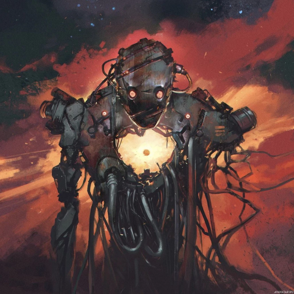 mechanical parts and what appears to be electrical or electronic components that might serve as its internal systems or sensors. It is set against a backdrop of red, black, and yellow hues, which could indicate a scene of destruction or chaos often associated with