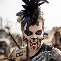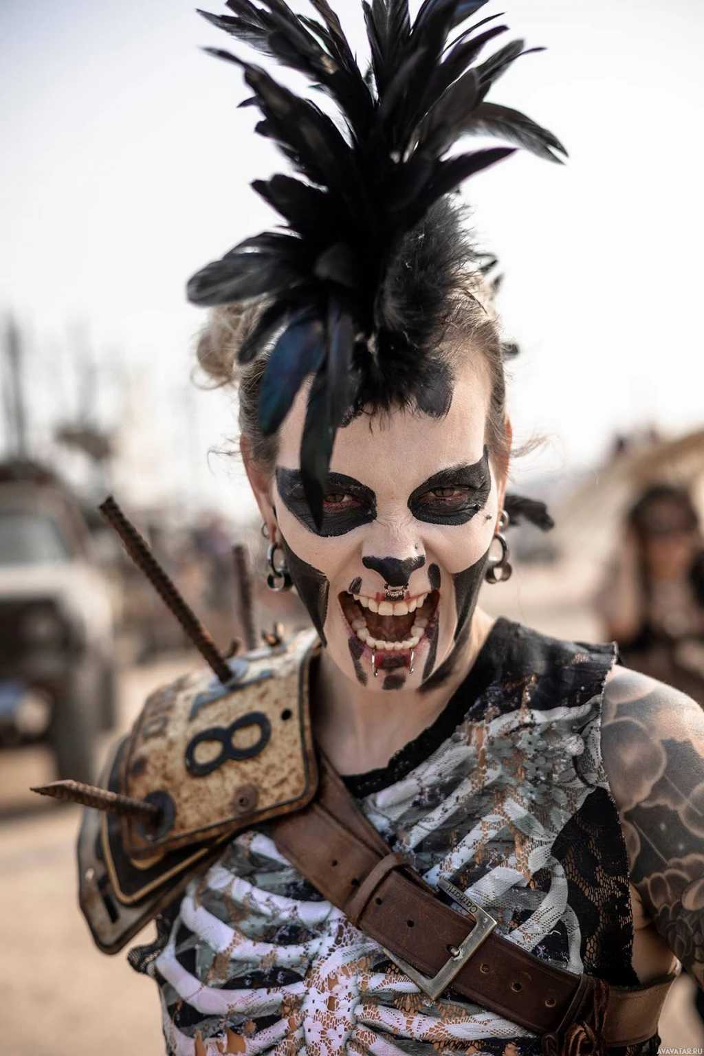 In the image, there is a person dressed in a post-apocalyptic style. The individual appears to be wearing a costume resembling a zombie or a warrior, with elements such as