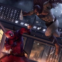 a combat situation. On the left, there is Deadpool, who is wearing his characteristic red and black costume with