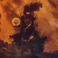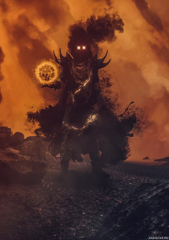a sense of drama in the scene, possibly indicating that this character is involved in some kind of quest or confrontation. The background is filled with smoke and rocks, suggesting