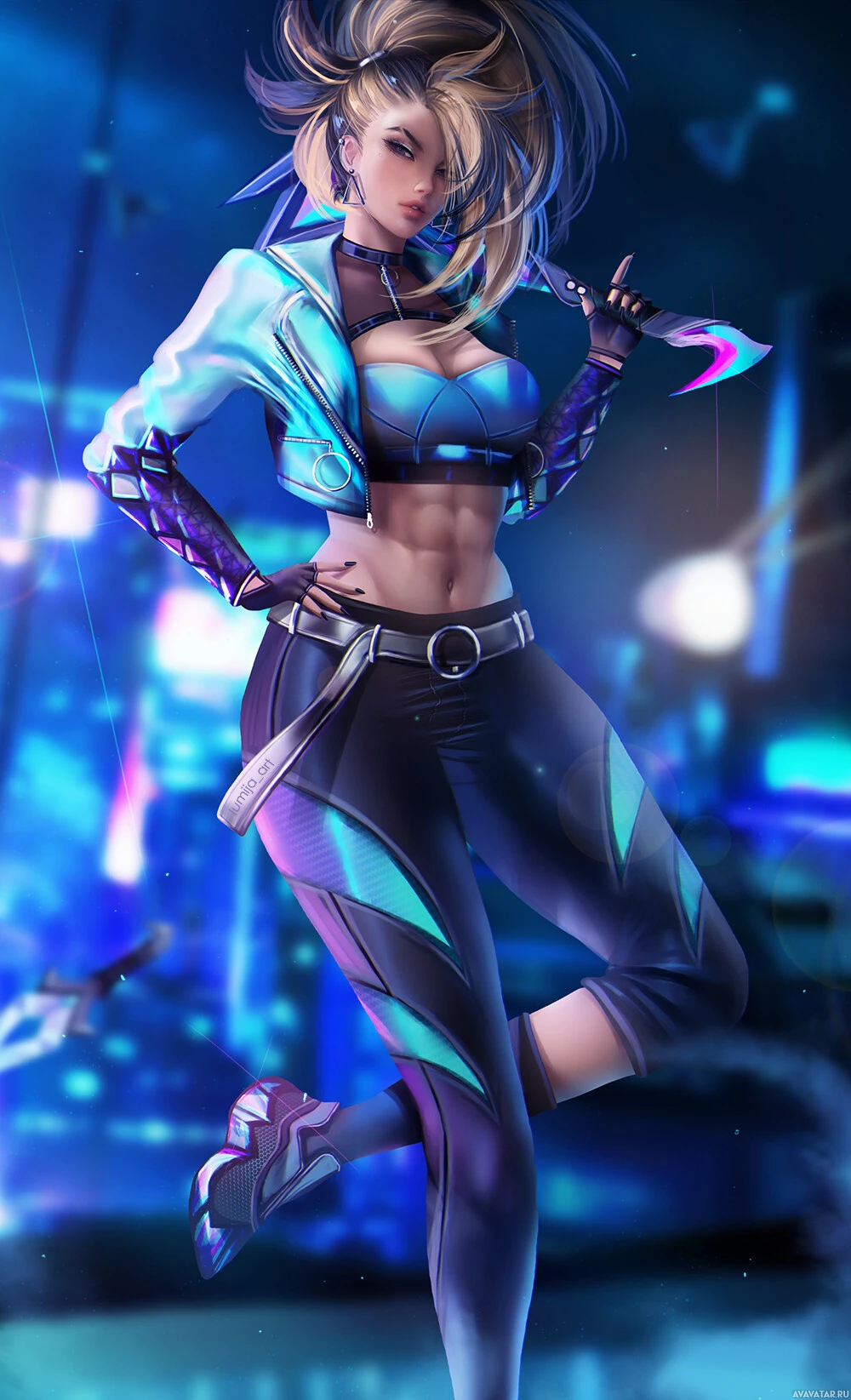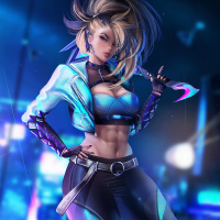 champion form, which includes a cyberpunk-inspired outfit and stylish hair. She holds a pair of throwing knives and has