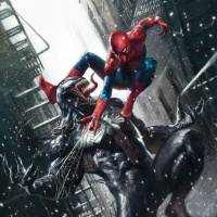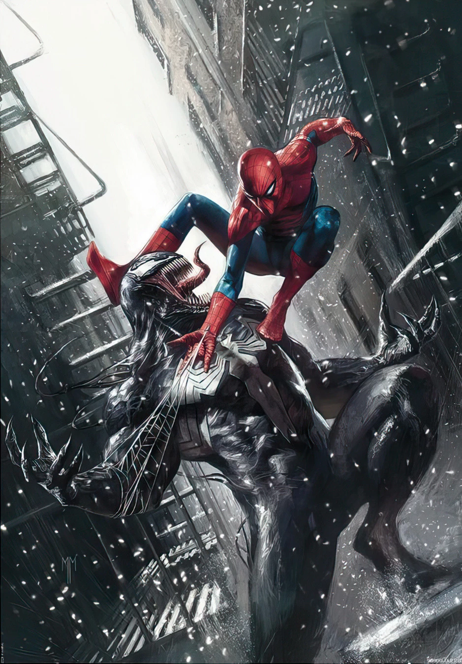 На картинке Человек-паук изображен на спине большого, угрожающего существа, похожего на Венома. Они находятся в городской среде, вокруг зданий и падающего снега. Обстановка напоминает зимнюю сцену в городском пейзаже.