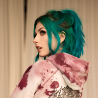 a young woman with turquoise hair. She has