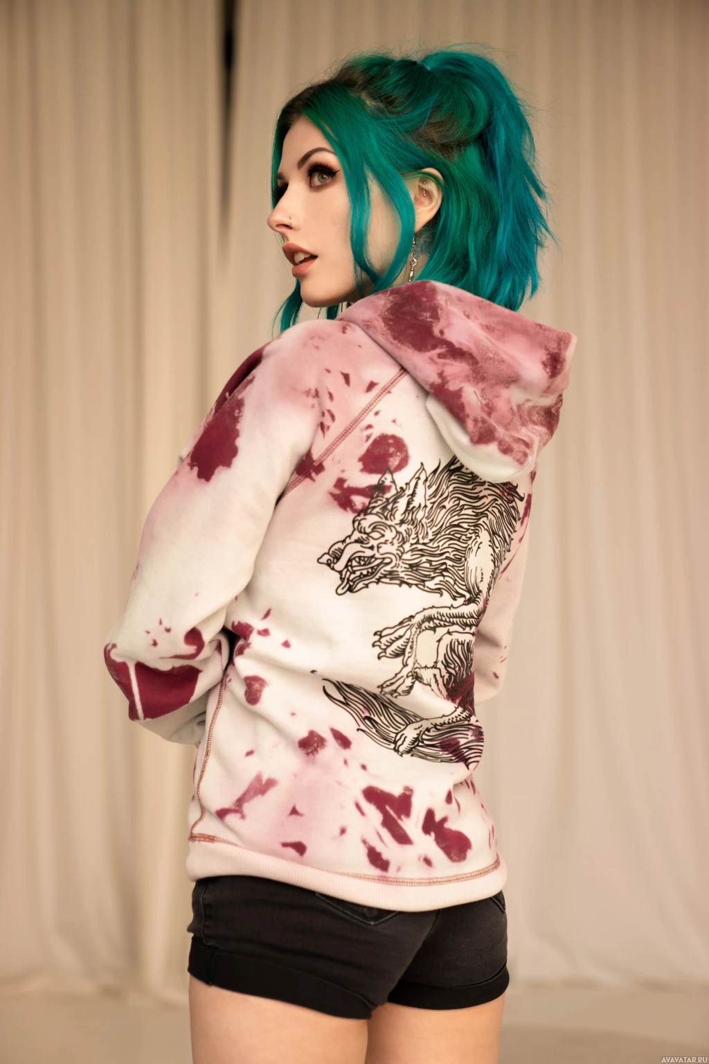 short hair and her attire consists of what looks like a hoodie or jacket with a vibrant design on the back, paired with black bottoms. The individual is standing in front of a plain background which could suggest