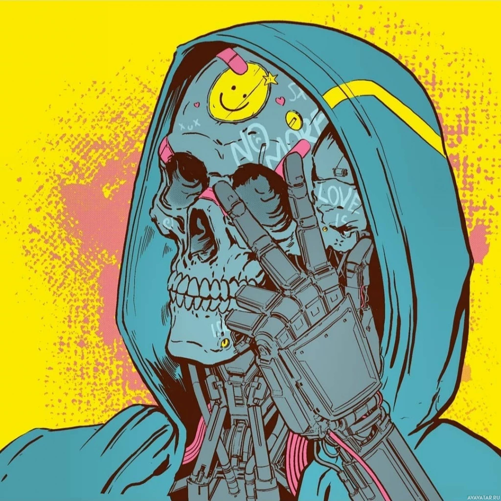 a skull for a head and is wearing a hood, which gives it an ominous or mysterious appearance. The background is vibrant with