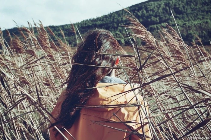 На картинке изображен человек, скорее всего, девушка или женщина, сидящая на открытом поле с высокими травами. Человек отворачивается от камеры в сторону горы или холма. Человек, кажется, носит светлую куртку, а сцена передает ощущение одиночества или созерцания.