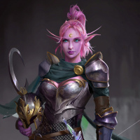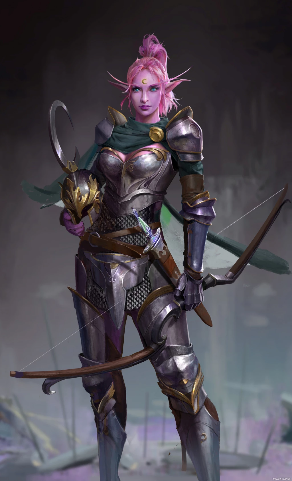 pink hair and is holding a bow and arrow, suggesting she might be an archer or warrior. She is wearing armor with elements of both human and elven design, possibly indicating her role as a guardian or protector in