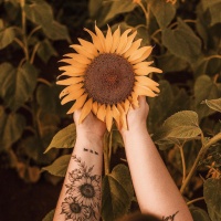 На картинке изображен человек, держащий в руках подсолнух на фоне поля подсолнухов. У подсолнуха, который держит человек, темная серединка и более светлые лепестки, в то время как у окружающих подсолнухов более светлая серединка и более темные лепестки. У человека есть татуировки на руках, видимые сквозь рукава. Эта сцена вызывает чувство единения с природой или, возможно, восхищение красотой этих ярких цветов.